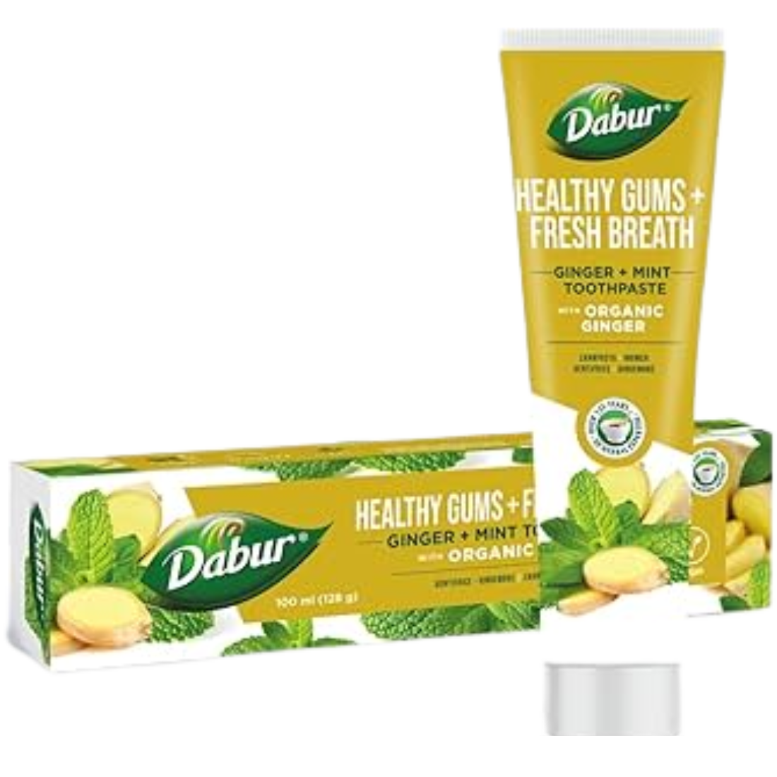 Dabur Ginger & Mint Toothpaste 100ML combines the natural goodness of ginger and refreshing mint to support effective oral hygiene. It helps cleanse teeth, freshen breath, and promote healthy gums with regular use. Suitable for daily brushing, it supports complete oral care as part of a regular routine in the UK.