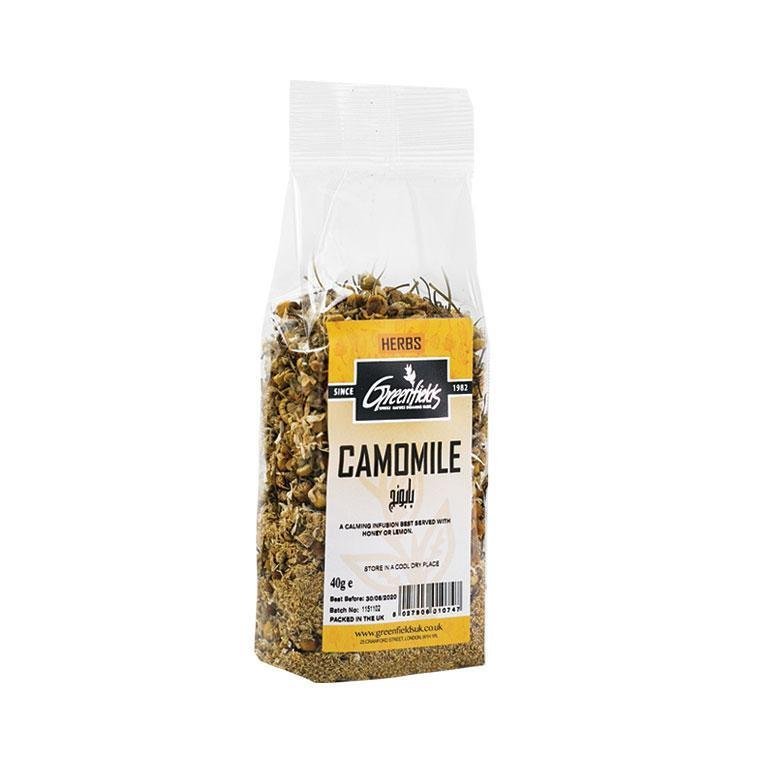 GREENFIELDS Camomile – 40g. Premium dried camomile flowers for calming teas, desserts, and natural remedies. Freshly packed and aromatic.