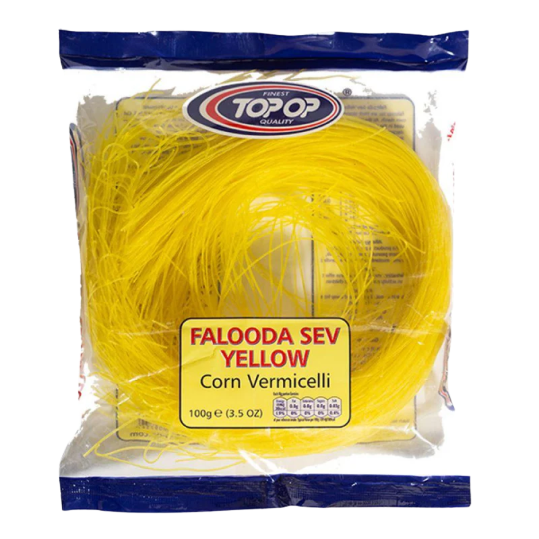 Topop Falooda Sev Yellow 100G is premium quality thin vermicelli specially made for falooda and chilled desserts. It cooks quickly, offers smooth texture, and enhances presentation with its bright colour. Hygienically packed to maintain freshness, making it ideal for traditional and modern dessert preparations in UK kitchens.
