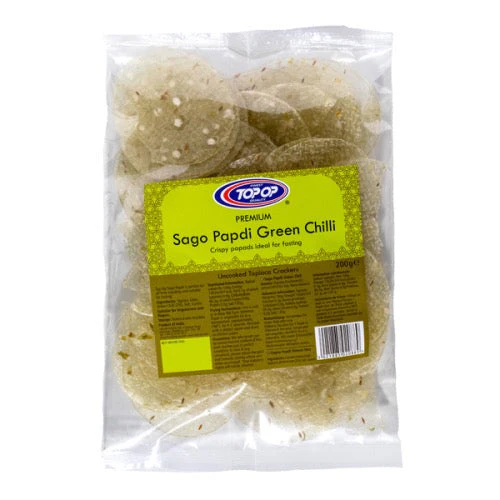 TOPOP Sago Papdi Green Chilli is a light, crunchy snack with a spicy twist.