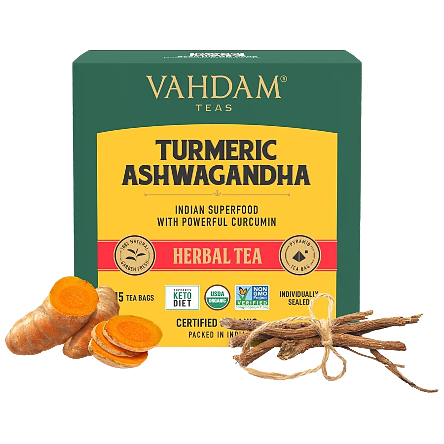 Vahdam Turmeric Ashwagandha Tea 30G includes 15 carefully crafted tea bags blending turmeric and ashwagandha for a warming and soothing herbal infusion. Made with premium ingredients, it offers a smooth flavour and calming aroma, ideal for daily wellness and relaxation in UK homes.